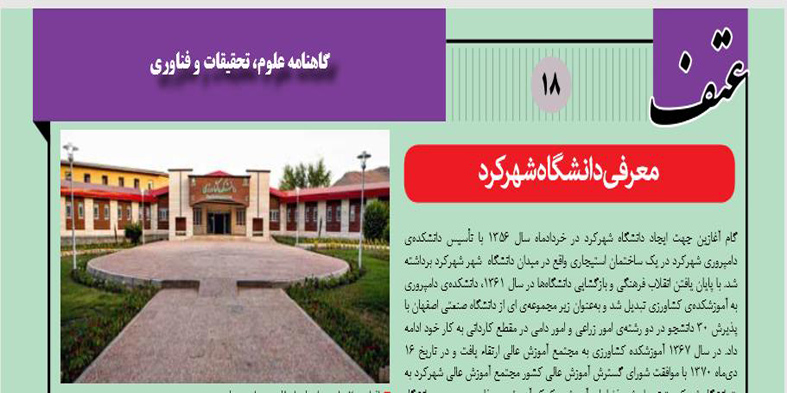 به گزارش روابط عمومی دانشگاه شهرکرد، مهمترین فعالیت های انجام شده در دانشگاه شهرکرد از سال 1393 تاکنون در حوزه های پژوهشی، آموزشی، دانشجویی و فرهنگی، توسعه زیرساخت ها، مشارکت های مردمی و خیّرین، همکاری های علمی بین المللی(سال 1397)، اقتصاد مقاومتی و دانش بنیان، مدیریت سبز و اقدامات رفاهی در صفحه های 18 و 19 شماره 22 گاهنامه خبری تحلیلی وزارت علوم، تحقیقات و فنآوری(عتف) در مرداد ماه منتشر شد.