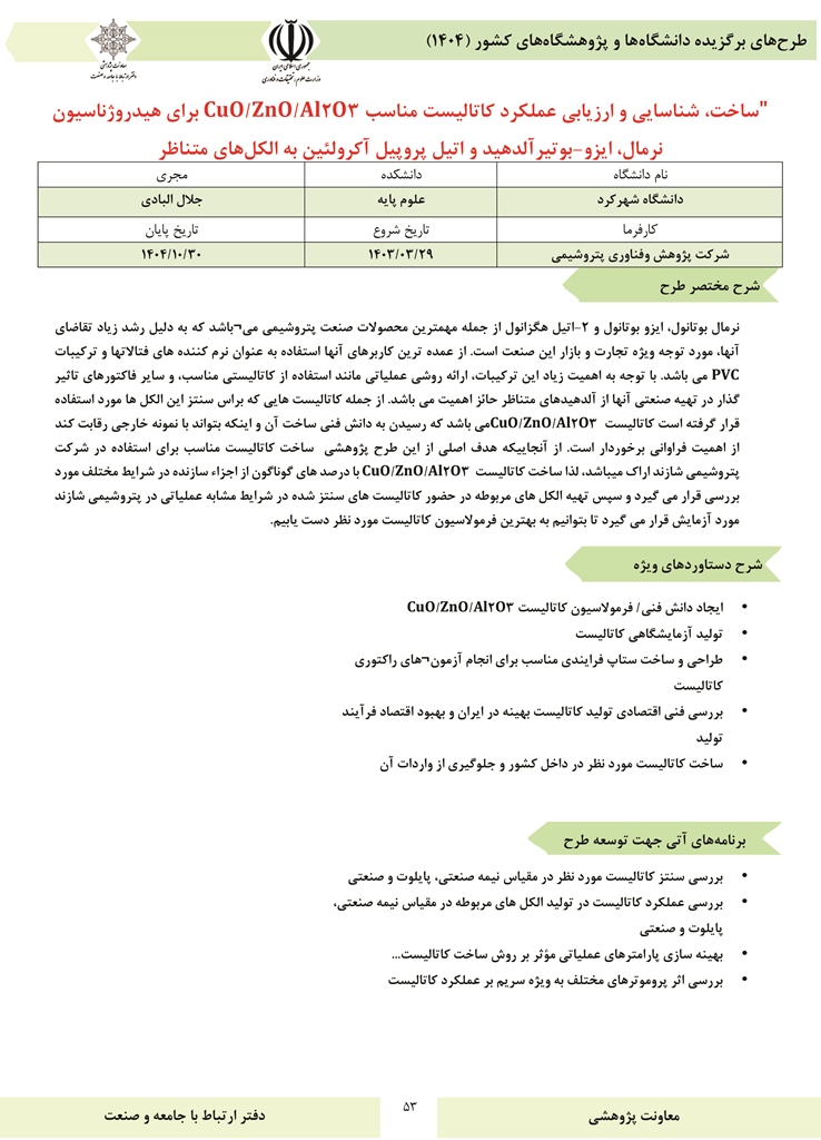 به گزارش روابط عمومی دانشگاه شهرکرد، طرح دکتر جلال البادی عضو هیات علمی دانشکده علوم پایه دانشگاه شهرکرد با عنوان "ساخت، شناسایی و ارزیابی عملکرد کاتالیست مناسب CUO/ZNO/AL2O3 برای هیدروژناسیون نرمال، ایزو-بوتیرآلدهید و اتیل پروپیل آکرولئین به الکلهای متناظر" به عنوان یکی از طرحهای برگزیده دانشگاهها و پژوهشگاههای کشور 1404 انتخاب شد.